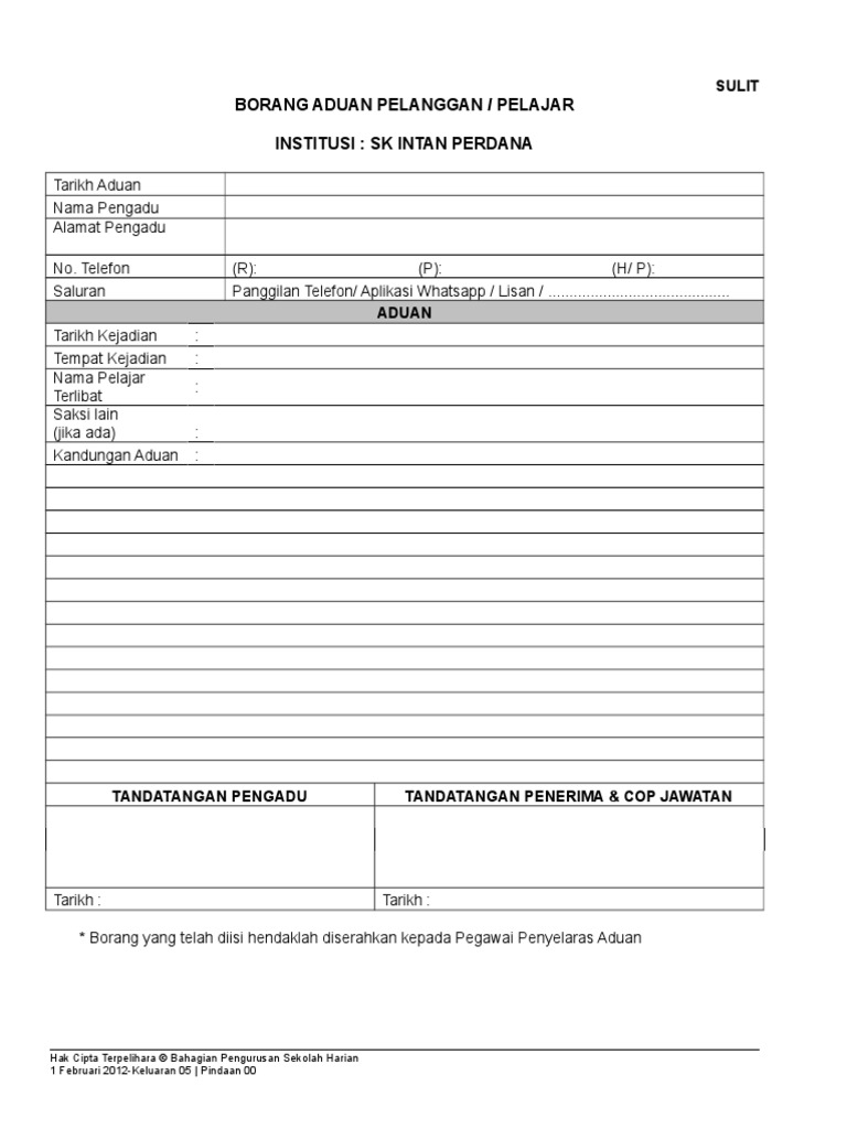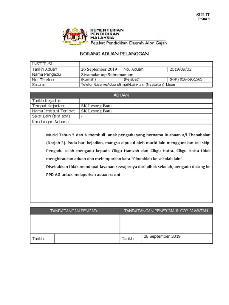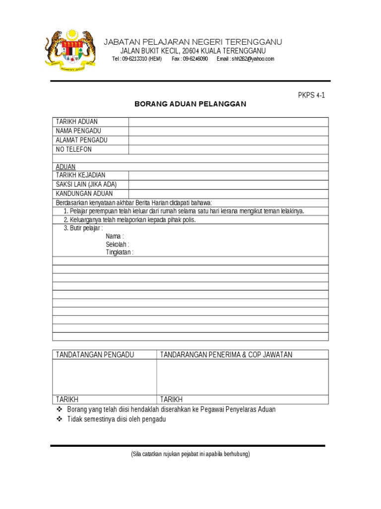 Contoh borang aduan borang aduan pelanggan bertulis lisan. Kegunaan pejabat pengadu tidak perlu mengisi ruang ini aduan direkod oleh. Aduan aduan yang boleh dikemukakan oleh orang awam. The copyright of the image is owned by the owner, this website only displays a few snippets of several keywords that are put together in a post summary. Larangan terhadap pemberian kandungan jelik dibawah akta komunikasi dan multimedia malaysia 1998 (akta 588). Saya berasa mudah berurusan dengan pentadbiran politeknik. More images for contoh borang aduan pelanggan » Contoh borang aduan pelanggan kad pengenalan alamat no. Aduan pelanggan dr lee oi wah pegawai kesihatan kawasan ii 2. Tindakan siasatan mdbg jabatan agensi luar lain lain. Contoh borang aduan pelanggan ketua pengarah pendidikan tinggi bidang kuasa yang dipertuan agong apa itu maqasid syariah cara menyelesaikan masalah obesiti di peringkat sekolah duit baru malaysia 2019 cameron highlands tanah rata cep point training 2018 borang lawatan ke luar negara Tindakan yang diambil oleh pihak pentadbiran terhadap aduan pelajar. 1 sangat memuaskan 2 memuaskan 3 kurang memuaskan.